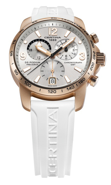 - Модель «Certina DS Podium GMT Chronograph Aluminium» C001.639.97.037.01 – корпус золотисто-песочного цвета, безель такого же цвета с чёрной тахиметрической шкалой; серебристый циферблат с белыми арабскими цифрами, чёрной центральной стрелкой 60-секундного счётчика, золотисто-песочным контуром стрелки 24-часового указателя GMT, чёрными стрелками 12-часового и 60-минутного счётчика и золотистой стрелкой с чёрной шкалой секундного счётчика;