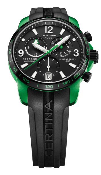 - Флагманская модель «Certina DS Podium GMT Chronograph Aluminium» C001.639.97.057.03 – зелёный корпус, безель чёрного цвета с зелёной тахиметрической шкалой; чёрный циферблат с белыми арабскими цифрами, зелёной центральной стрелкой 60-секундного счётчика, зелёным контуром стрелки 24-часового указателя GMT, зелёными стрелками 12-часового и 60-минутного счётчика и белой стрелкой с белой шкалой секундного счётчика;