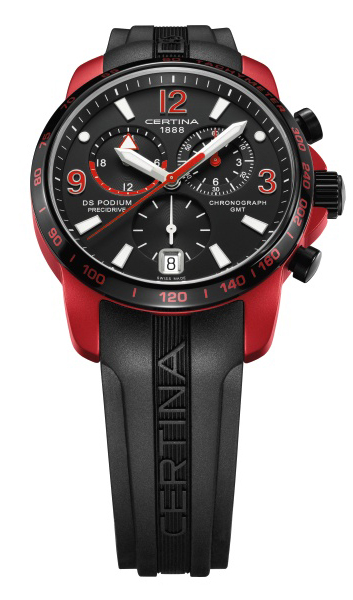 - Модель «Certina DS Podium GMT Chronograph Aluminium» C001.639.97.057.01 – красный корпус, безель чёрного цвета с красной тахиметрической шкалой; чёрный циферблат с красными арабскими цифрами, красной центральной стрелкой 60-секундного счётчика, красным контуром стрелки 24-часового указателя GMT, красными стрелками 12-часового и 60-минутного счётчика и белой стрелкой с белой шкалой секундного счётчика;
