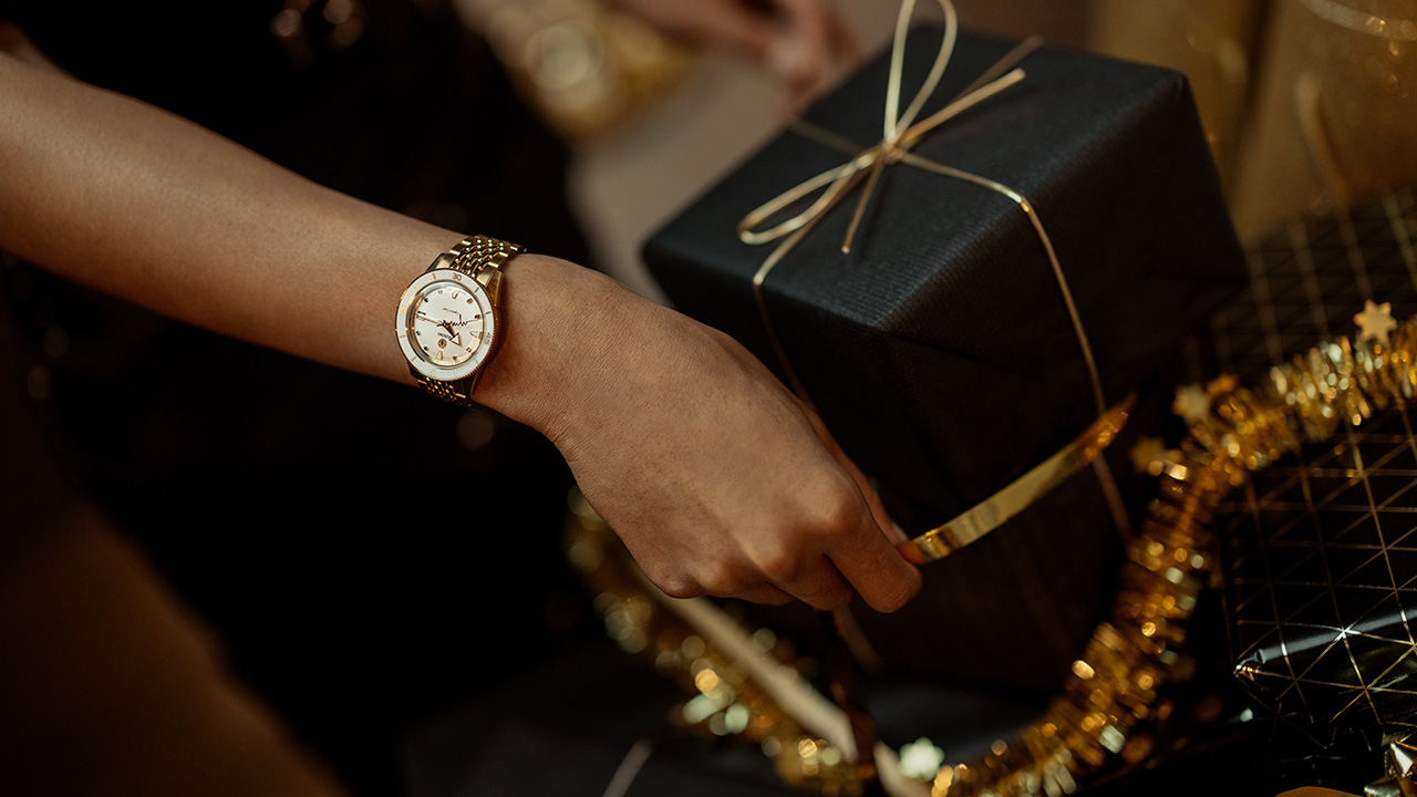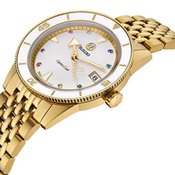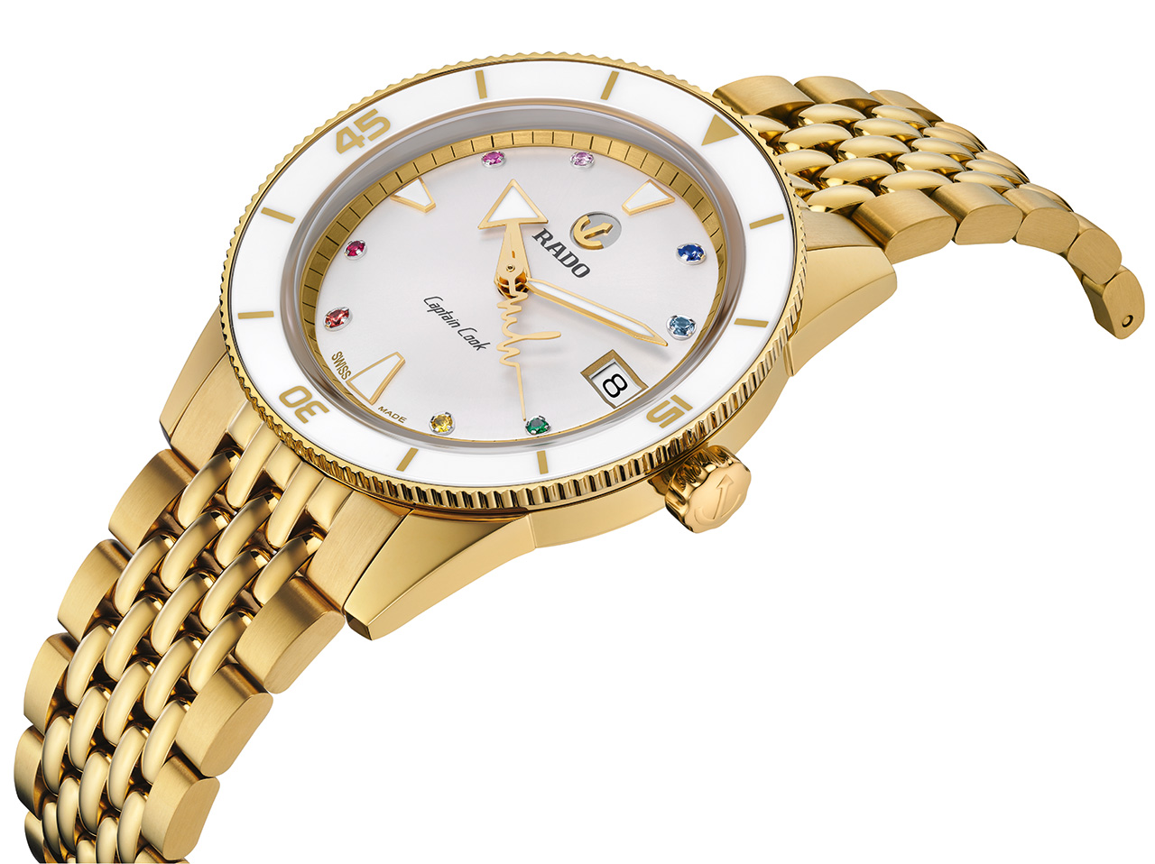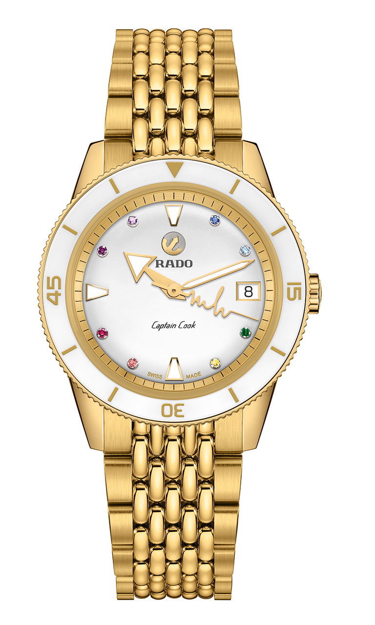 Новый Rado Captain Cook «сердцебиение Марины Хоерманседер» – это приглашение отпраздновать все то, что любят в берлинском районе Кройцберг, и уникальность во всем. Новые часы украшены красочной радугой из восьми драгоценных камней и нанесенными на яркий и выразительный циферблат индексами, поверхность которого перекликается с белой высокотехнологичной керамической вставкой во вращающемся безеле. Золотистые металлизированные метки и цифры и с лазерной гравировкой идеально сочетаются с полированным PVD-покрытием желто-золотого цвета корпуса и безеля из нержавеющей стали. Циферблат и символ золотого движущегося якоря с серебристой задней панелью, темно-серые логотипы Rado и Captain Cook защищены изысканным сапфировым стеклом в форме коробки, хорошо известным любителям продукции Captain Cook. Кристалл имеет прозрачное покрытие на обеих гранях, а на часовую и минутную стрелки нанесено белое покрытие Super-LumiNova® для максимальной читаемости.