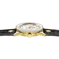 Внутри размещен автоматический механизм Rado R763 с 25 камнями, тремя стрелками и окошком даты в положении «3 часа». Антимагнитная пружина NivachronTM обеспечивает модели 80-часовой запас хода с регулировкой в пяти положениях. Дополнительное сапфировое стекло на завинчивающейся задней крышке корпуса позволяет любознательным ценителям часов любоваться работой этой оригинальной модели Captain Cook от Marina Hoermanseder X, водонепроницаемость которой составляет до 10 бар (100 м). Часы поставляются с тремя различными вариантами браслета или ремешка. Первый браслет из нержавеющей стали с PVD-покрытием цвета желтого золота, полированный или матовый, типа рисовых зерен, с тройной застежкой из полированной нержавеющей стали. Дополнительный черный ремешок из кожи НАТО двойной длины (с тиснением под кожу аллигатора) с фирменной пряжкой Marina из нержавеющей стали с PVD-покрытием желто-золотого цвета. В комплект входит еще один черный кожаный ремешок стандартной длины с таким же рельефным рисунком аллигатора и пряжкой из нержавеющей стали с PVD-покрытием желто-золотого цвета. Часы поставляются в красивом черном чехле под брендом Marina Hoermanseder.