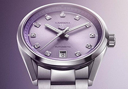 TAG Heuer Carrera Date 36 mm - новая версия культовой Carrera с притягательным лиловым циферблатом: спиральное сатинирование и градиентная разметка добавляют глубины и динамики при любом освещении, а бриллиантовые индексы дают деликатный, но уверенный акцент роскоши.