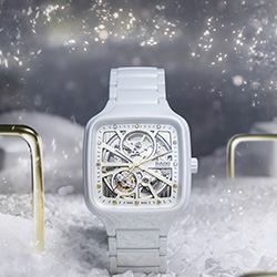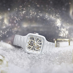 Rado True Square Open Heart (R27073722) - светлая праздничная противоположность. Белая высокотехнологичная керамика, мягко закруглённый квадратный корпус и полностью открытое «сердце» механизма R734 Open Heart создают ощущение воздушности. Сквозь сапфировое стекло на циферблате и в титановой задней крышке можно видеть перламутрово-белую платину и украшенный «женевскими волнами» держатель механизма. Лёгкий керамический браслет с шелковистой фактурой делает модель особенно приятной в повседневной носке.