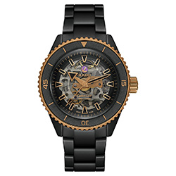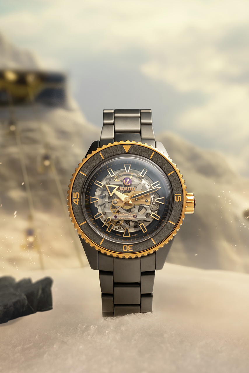 Rado Captain Cook (R32190153) в этой линейке представлен в новом образе: корпус и браслет из матовой чёрной высокотехнологичной керамики, заводная головка и частично безель из нержавеющей стали с покрытием розового золота, внутренний безель из полированной черной керамики. Сквозь дымчатый скелетонизированный циферблат видно автоматический калибр R808 с декором «женевские волны» (Côtes-de-Genève) и 25 камнями. Модель выглядит мощно и современно, сохраняя дух исторического дайвера как идеальный вариант для тех, кто выбирает спортивную роскошь.