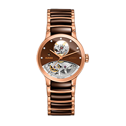 4. Rado Centrix Automatic Open Heart Gent 01.734.0179.3.030 Корпус из нержавеющей полированной стали. Скелетонированный циферблат шоколадно-коричневого цвета с покрытыми родием центральными стрелками и условными накладными часовыми индексами. Задняя крышка корпуса из прозрачного сапфира. Браслет из нержавеющей полированной стали с шоколадно-коричневыми полированными промежуточными звеньями из высокотехнологичной керамики и раскладывающейся титановой застёжкой. |