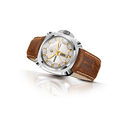Корпус из закалённого серебристого титана 5 класса с полированной и матовой отделкой. Белый циферблат с центральными стрелками, условными часовыми индексами, указателем дня недели / даты и декоративным якорем с жёлто-золотым PVD-покрытием. Винтажный ремешок из натуральной кожи с раскладной титановой застёжкой.