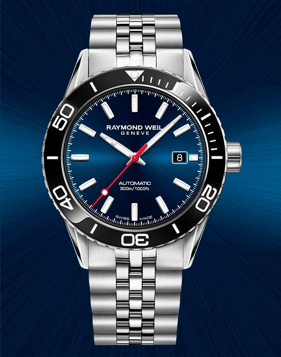 Эти часы, выполненные в стиле американского флага, доступны с каучуковым ремешком с перфорацией или браслетом из пяти рядов. Синий циферблат с солнечными лучами и красная секундная стрелка символизируют ценности свободы и независимости, которые разделяют RAYMOND WEIL и флаг Old Glory.