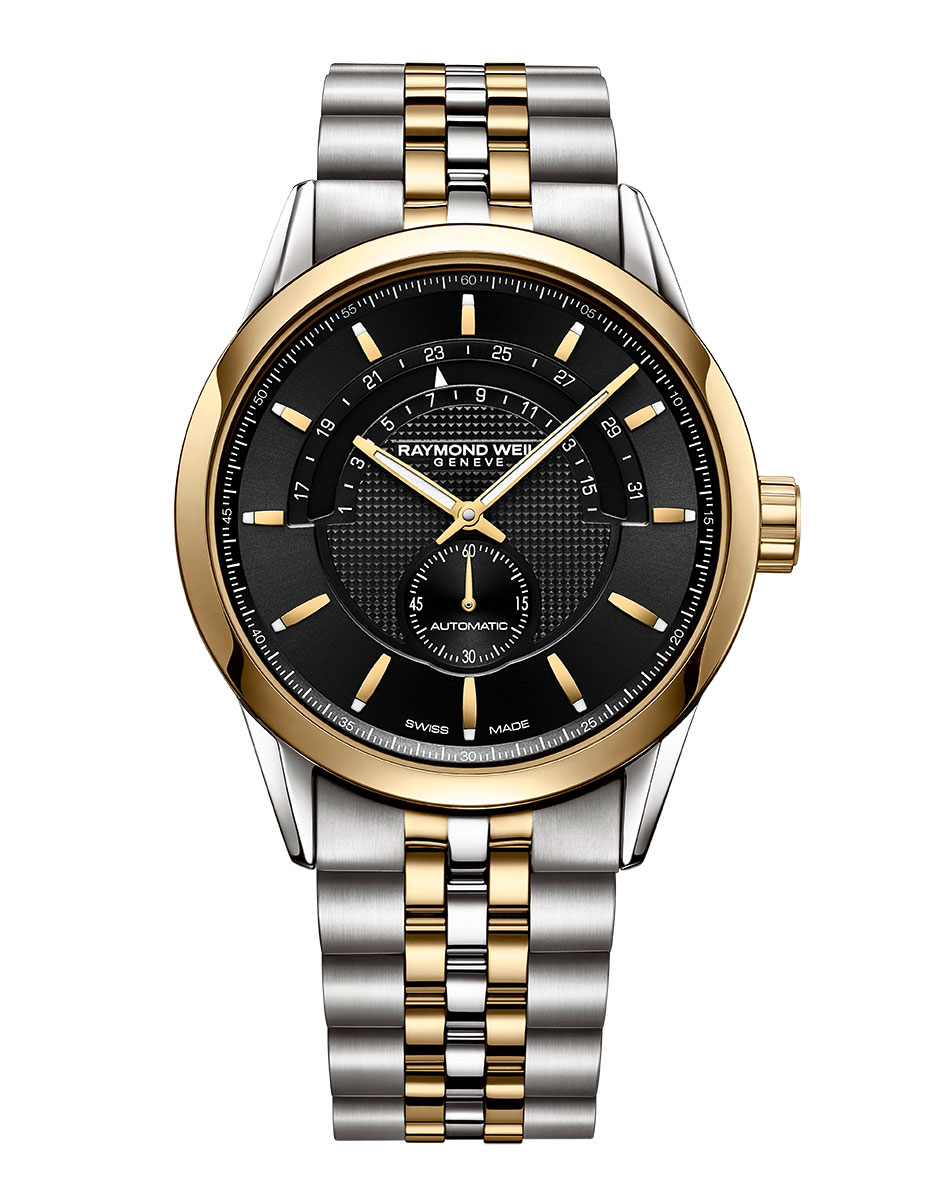Новинки представлены в двух вариантах. Первый – в исполнении из полированной нержавеющей стали с синим циферблатом и серебристыми индексами. Второй – двухцветный с черными циферблатом, индексами и стрелками цвета желтого золота с белым люминесцентным покрытием Super-Luminova®. Новые модели привносят во флагманскую линейку RAYMOND WEIL freelancer современную урбанистическую тональность.