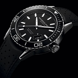 Корпус из нержавеющей полированной стали, чёрный керамический безель с белой люминесцентной шкалой. Чёрный циферблат с центральными стрелками и условными индексами с белым люминесцентным покрытием. Окошко даты. Чёрный каучуковый перфорированный ремешок, раскладывающаяся застёжка с двойной фиксацией из нержавеющей полированной стали.
