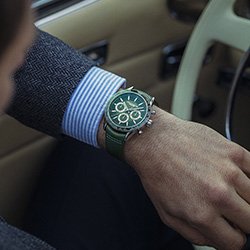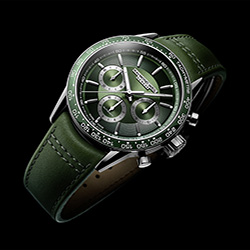 Пожалуй, одной из самых привлекательных моделей новой коллекции является модель 7741-SC7-52021, представленная в завораживающем зеленом цвете. У этой модели 30-минутный и 12-часовой окошки хронографа оснащены хорошо читаемыми белыми стрелками, а все три счетчика обрамлены серебристыми кругами. Часть циферблата с часовыми метками выполнена в виде улитки – это придает дисплею восхитительную текстуру. А уникальный цвет циферблата добавляет модели привлекательности.