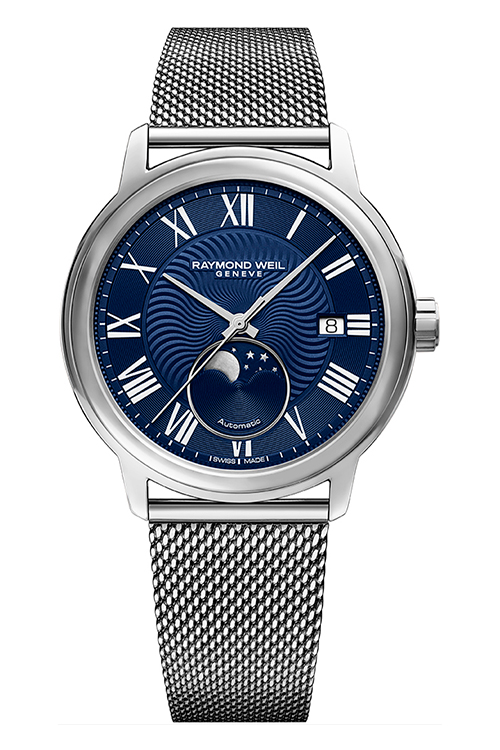 RAYMOND WEIL представляет модель Moon Phase из коллекции Maestro — часы в классическом стиле с элегантным индикатором фаз Луны. Новый элемент синхронизирует ритм времени со звездами и выполнен в лучших традициях швейцарского часового дела.