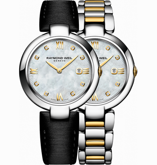 Циферблат часов «Raymond Weil Shine Ladies» с центральными листовидными стрелками часов и минут и окошечком даты на отметке «3 часа» имеет несколько вариантов исполнения: