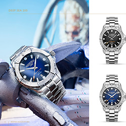 Модель DEEP SEA 200 оснащена сапфировым стеклом с антибликовым покрытием и 43-миллиметровым корпусом из нержавеющей стали в форме круга, в котором установлен надежный высококачественный кварцевый механизм швейцарского производства. Декоративный волнистый циферблат серебристого, черного или синего цвета привлекает внимание любителей как спортивного стиля, так и классики. Корпус и браслет выполнен из нержавеющей стали 316L.
