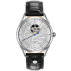 3. Roamer Swiss Matic Swinging Heart 550661-41-52-05 Корпус из нержавеющей стали с матовой отделкой. Чёрный циферблат с центральными серебристыми стрелками, накладными серебристыми римскими цифрами и усложнением «Swinging Heart». Чёрный ремешок из натуральной кожи с застёжкой-бабочкой из нержавеющей стали. |