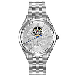 2. Roamer Swiss Matic Swinging Heart 550661-41-22-50 Корпус из нержавеющей стали с матовой отделкой. Серебристый циферблат с декором «Sunray», центральными серебристыми стрелками часов и минут, синей центральной секундной стрелкой, с накладными серебристыми римскими цифрами и усложнением «Swinging Heart». 5-рядный браслет из нержавеющей стали с матовой отделкой и застёжкой-бабочкой из нержавеющей стали. |