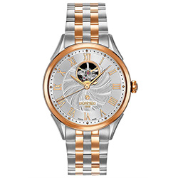 6. Roamer Swiss Matic Swinging Heart 550661-49-22-50 Корпус из нержавеющей стали с PVD-покрытием из розового золота. Серебристый циферблат с декором «Sunray», центральными стрелками и накладными римскими цифрами с розовой позолотой, с усложнением «Swinging Heart». 5-рядный браслет из нержавеющей стали с чередованием звеньев с матовой и розово-золотой отделкой, с застёжкой-бабочкой из нержавеющей стали. |