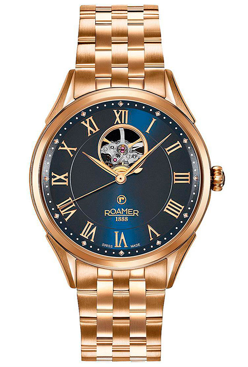 8. Roamer Swiss Matic Swinging Heart 550661-49-42-50 Корпус из нержавеющей стали с PVD-покрытием из розового золота. Синий циферблат с центральными стрелками и накладными римскими цифрами с розовой позолотой, с усложнением «Swinging Heart». 5-рядный браслет с застёжкой-бабочкой из нержавеющей стали с PVD-покрытием из розового золота. |