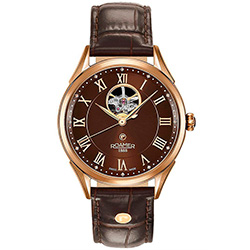 9. Roamer Swiss Matic Swinging Heart 550661-49-62-05 Корпус из нержавеющей стали с PVD-покрытием из розового золота. Коричневый циферблат с центральными стрелками и накладными римскими цифрами с розовой позолотой, с усложнением «Swinging Heart». Коричневый ремешок из натуральной кожи с застёжкой-бабочкой из нержавеющей стали с розовой позолотой. |