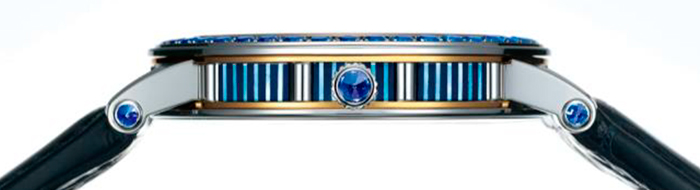 - Инкрустирован 48 сапфирами (3,22 карат, включая сапфиры в дужках и заводной головке).
