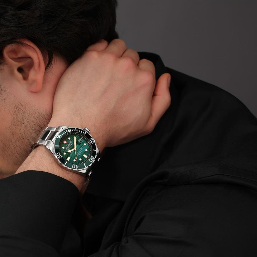 Diver Green Water - модель, вдохновлённая изумрудной рекой Верзаска. Малахитовый циферблат передаёт глубину воды, а корпус 44 мм из нержавеющей стали с водозащитой 20 ATM делает модель надёжной для дайвинга. Односторонний безель, сапфировое стекло и стальной браслет — это классика, созданная для приключений.