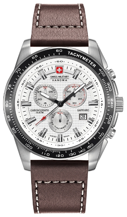 1. Swiss Military Hanowa Crusader Chrono 6-4225.04.001: корпус из нержавеющей стали 316L, безель с чёрным ионным покрытием и тахиметрической шкалой, белый циферблат с часовыми индексами стального цвета, коричневый кожаный ремешок с белой прострочкой. | |