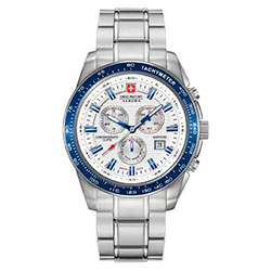 6. Swiss Military Hanowa Crusader Chrono 6-5225.04.001.03: корпус из нержавеющей стали 316L, безель с ионным покрытием синего цвета и тахиметрической шкалой, белый циферблат с часовыми индексами синего цвета, браслет из нержавеющей стали. | |