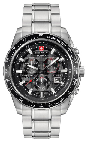 9. Swiss Military Hanowa Crusader Chrono 6-5225.04.007: корпус из нержавеющей стали 316L, безель с ионным покрытием чёрного цвета и тахиметрической шкалой, чёрно-серый циферблат с часовыми индексами серого цвета, браслет из нержавеющей стали. |