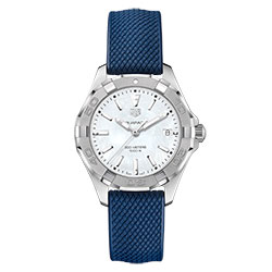 Самым привлекательным акцентом новых женских моделей Aquaracer стал всплеск синего цвета – глубокий и чарующий оттенок, который напоминает о счастливых днях, проведенных на яхте. Синий циферблат обладает эффектом sunray и украшен выгравированным узором в виде песчаных волн. Орнамент напоминает о нежных волнах, набегающих на песчаные берега тропического пляжа. Две модели Aquaracer Ladies с синим циферблатом представлены на браслете из нержавеющей стали или на каучуковом ремешке того же синего оттенка. Текстура ремешка имитирует парусный канат, что в очередной раз подчеркивает принадлежность к коллекции Aquaracer. Каучуковый ремешок идеально подходит для занятий водными видами спорта. Он прочный, удобный, легкий и водонепроницаемый. Третью модель Aquaracer Ladies украшает элегантный перламутровый циферблат на каучуковом ремешке. Каждая модель оснащена указателем даты.