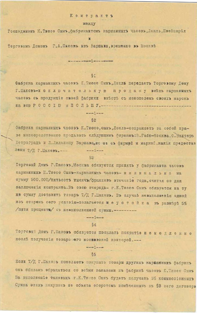 Так, например, в письме Шарля Тиссо своему брату Эдуарду Тиссо от 11 июля 1917 г. сообщается о том, что компании всё труднее удовлетворять просьбы о поставке товара в Россию, поскольку спрос на часы постоянно опережает предложение и увеличение объёмов производства не поспевает за возрастающей потребностью российского рынка.