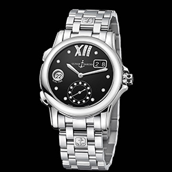 11. Модель 3343-222-7/30-02 Корпус из нержавеющей стали, чёрный циферблат, большая римская цифра «XII» с 12 бриллиантами, 8 бриллиантов в качестве условных часовых индексов, 12 бриллиантов на малом секундном циферблате. Браслет из нержавеющей стали |