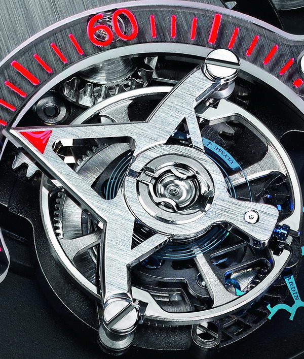Другим, не менее ярким, примером использования компанией «Ulysse Nardin« научных знаний и опыта в современном часовом производстве является секундная стрелка в часах «Freak Diavolo«. Её функцию обеспечивает парящий турбийон, который заменил обычный осциллятор, традиционно используемый в других моделях серии «Freak«.