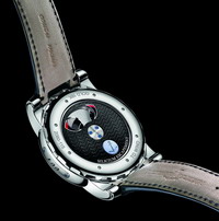 Водонепроницаемый корпус часов из белого золота (18 карат) оборудован стрелкой, которая указывает секунды на прозрачной полуокружности, вращающейся со скоростью один оборот в минуту с неизменным отправным положением на оси минутной стрелки.