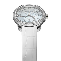 3. Ulysse Nardin Jade Jewellery Steel 3103-125B/591: корпус из нержавеющей стали, безель, украшенный бриллиантами круглой огранки общим весом 0,844 карата; белый перламутровый циферблат с инкрустацией из бриллиантов общим весом 0,332 карата; белый ремешок из кожи аллигатора с раскладывающейся застёжкой из нержавеющей стали. | |