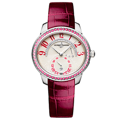 1. Ulysse Nardin Jade Jewellery White Gold 3100-125B/591.6: корпус из 18-каратного белого полированного золота, безель с рубинами круглой огранки; белый перламутровый циферблат с бриллиантовой инкрустацией общим весом 0,332 карата; ремешок из кожи аллигатора рубинового (тёмно-малинового) цвета с раскладывающейся застёжкой из 18-каратного белого полированного золота. | |