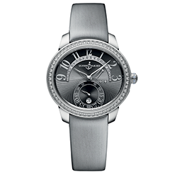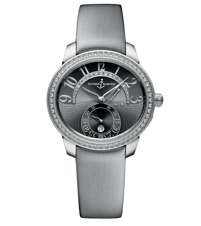 2. Ulysse Nardin Jade Jewellery White Gold 3100-125B/592: корпус из 18-каратного белого полированного золота, безель с бриллиантами круглой огранки общим весом 0,844 карата; графитовый циферблат, инкрустированный бриллиантами общим весом 0,332 карата; серый сатиновый ремешок с классической застёжкой из 18-каратного белого полированного золота. | |