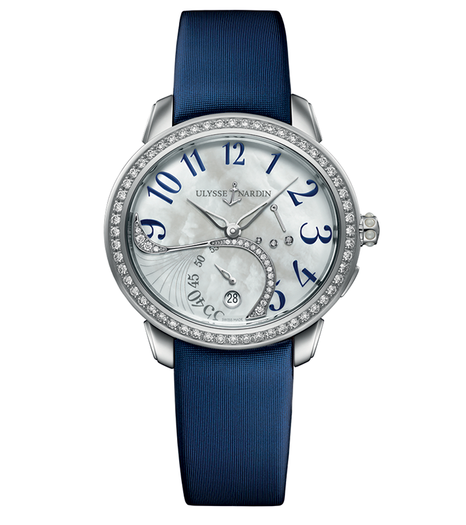 4. Ulysse Nardin Jade Jewellery Steel 3103-125B/591.3: корпус из нержавеющей стали, безель, украшенный бриллиантами круглой огранки общим весом 0,844 карата; белый перламутровый циферблат с инкрустацией из бриллиантов общим весом 0,332 карата; синий атласный ремешок с раскладывающейся застёжкой из нержавеющей стали. |