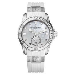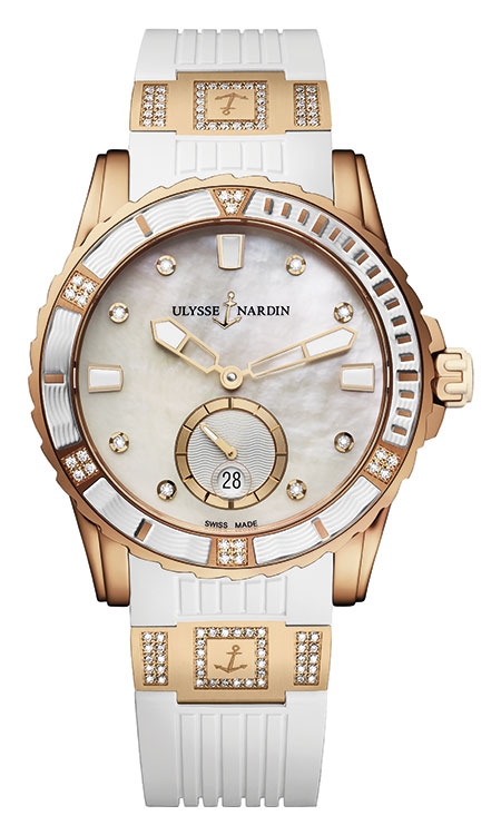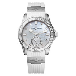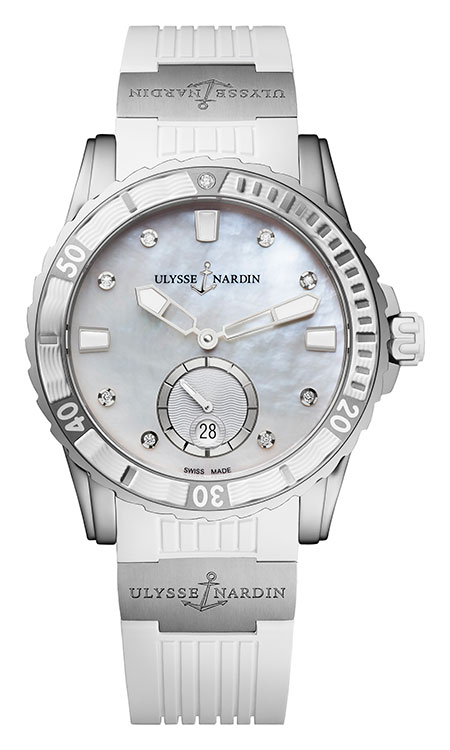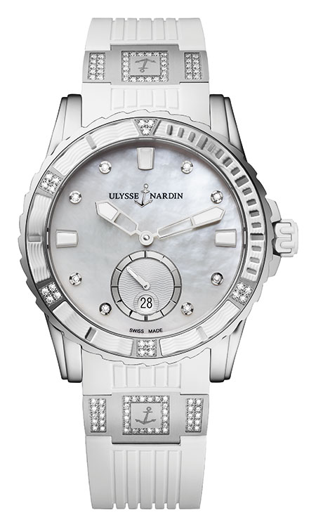 Корпус из полированной нержавеющей стали. Безель с белым вулканизированным каучуковым покрытием и одним бриллиантом весом 0,013 карата. Белый перламутровый циферблат с центральными стрелками часов и минут, малой секундной стрелкой, окошком даты, с условными накладными индексами, восемь из которых являются бриллиантами общим весом 0,062 карата. Белый каучуковый ремешок, украшенный вставками из нержавеющей стали с логотипом Ulysse Nardin и раскладывающейся стальной застёжкой.