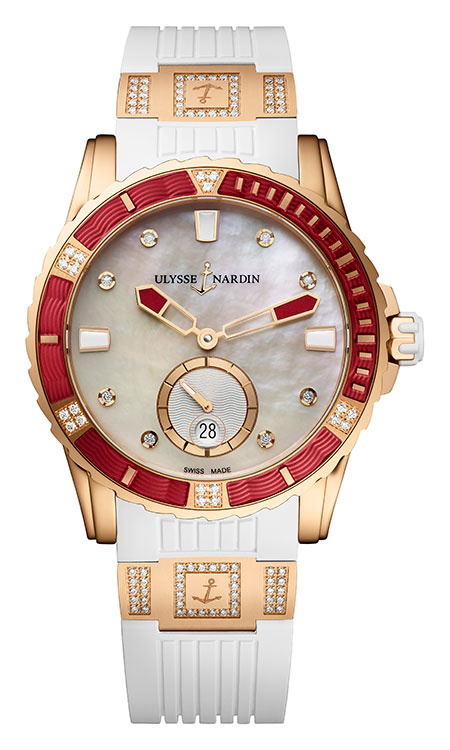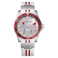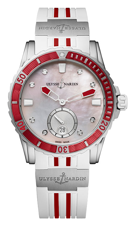 Корпус из полированной нержавеющей стали. Безель с красным вулканизированным каучуковым покрытием и одним бриллиантом весом 0,013 карата. Белый перламутровый циферблат с центральными стрелками часов и минут, малой секундной стрелкой, окошком даты, с условными накладными индексами, восемь из которых являются бриллиантами общим весом 0,062 карата. Белый каучуковый ремешок с двумя красными полосками, вставками из нержавеющей стали с логотипом Ulysse Nardin и раскладывающейся стальной застёжкой.