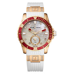 Корпус из полированного 18-каратного розового золота (5N). Безель с красным вулканизированным каучуковым покрытием и девятнадцатью бриллиантами общим весом 0,115 карата. Белый перламутровый циферблат с центральными стрелками часов и минут, малой секундной стрелкой, окошком даты, с условными накладными индексами, восемь из которых являются бриллиантами общим весом 0,062 карата. Белый каучуковый ремешок со вставками из 18-каратного розового золота (5N), декором из восьмидесяти бриллиантов общим весом 0,40 карата, гравированным якорем и раскладывающейся розово-золотой застёжкой.