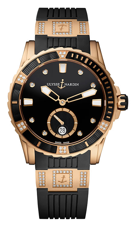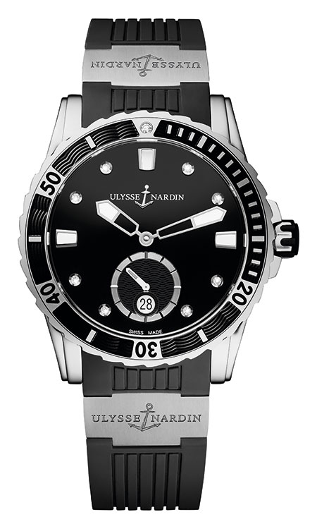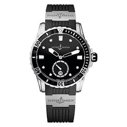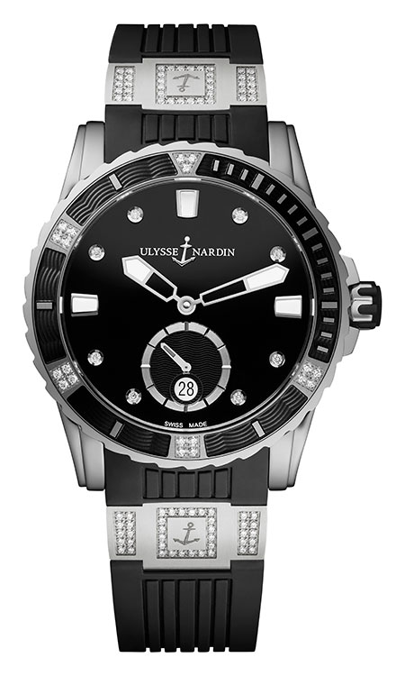 Корпус из полированной нержавеющей стали. Безель с сине-чёрным вулканизированным каучуковым покрытием и одним бриллиантом весом 0,013 карата. Сине-чёрный циферблат с центральными стрелками часов и минут, малой секундной стрелкой, окошком даты, с условными накладными индексами, восемь из которых являются бриллиантами общим весом 0,062 карата. Каучуковый ремешок сине-чёрного цвета, украшенный вставками из нержавеющей стали с логотипом Ulysse Nardin и раскладывающейся стальной застёжкой.