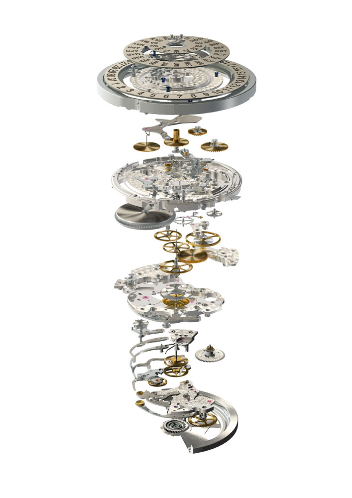 Оптимальная считываемость показаний календаря отображается с помощью трёх вращающихся дисков: внешнего, показывающего дату, среднего, демонстрирующего месяц, и внутреннего – на котором отображается день недели. Устройство календаря отличается простотой и оригинальностью конструкции. Так, если в месяце насчитывается 31 день, то месячный диск переводится числовым диском как обычно, а если в месяце 30 дней, то месячный диск обеспечивает переход числового диска, минуя 31-е число. Корректировка годового календаря осуществляется только в том случае, когда заканчивается февраль и начинается март. Эта невероятно простая конструкция состоит из девяти подвижных элементов, а, например, в большей части других календарей количество подвижных элементов достигает от 30 до 40 единиц.